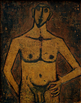 Padamsee, draws his figures and forms from the world around him that he knows intimately, but he invests them with a profound sense of alienation. They are not heroic creatures, nor are they angst –ridden, shattered beings. They exist, and on their flesh and bones is stamped the experience of living.