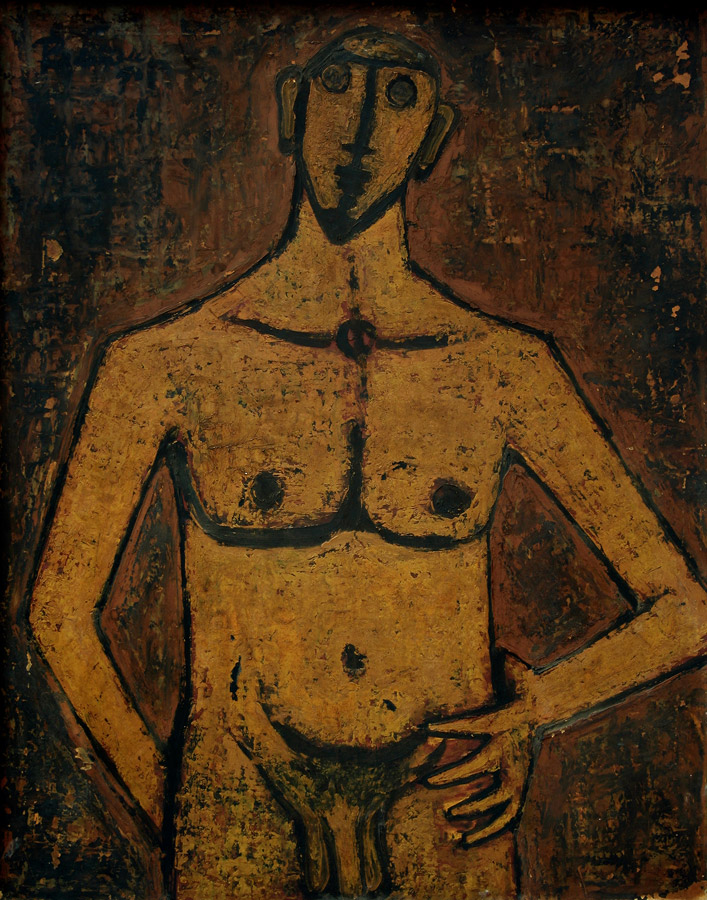 This moving from figurative work to landscapes, only to return once again to figurative painting, is not a new phenomenon in the artist's oeuvre. An examination of his development as an artist will illustrate this. Padamsee's years as a student in India was a time of preparation. He went to Paris in 1951 and already his figuration was under¬going a change. The transformation from the female forms painted in 1951 with their elemental faces like primitive cult objects. and their attenuated bodies to the growing physical presence of the figures was a major one. From 1955 onwards, the defining contours began to disappear. The canvases grew in size and the figures became more and more massive.