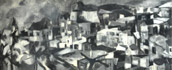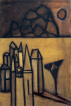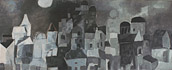 “The subject matter is chosen to allow possibility of using colour, “ Padamsee says”,but there must be something uncanny there. Unless it is a disquieting,uncanny landscape I would reject it,” This preoccupation with “disquieting feeling” links various phases of Padamsee’s landscape painting, though at first sight they appear to vary greatly in the formal means used. For instance, the sun and moon flood the cityscapes of the Horizon paintings with an unearthly light. This gives the paintings a quality of an hallucination, despite what appears to be the reassuring warmth of sumptuous colour. Both in these landscapes and the “sun and moon metascapes”, painted in the ‘seventies, the colours are offset by blues that are electrifying as well as suffused with darkness. “ Blue is not only the colour of the sky,” Padamsee says, “ but can be make to project itself forward, contrary to its receding nature and possesses a psychological dimension, to evoke in the viewer a special feeling or mood. A tension between colour and colour creates planar movement, absence of the complementary creates expectation leading the mind into a quest of the imagination.”