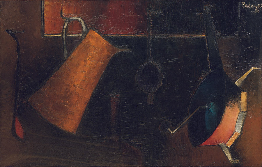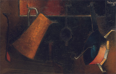 Almost the only period in time when Padamsee has experimented with still-life was in 1956.His still-lifes show ordinary kitchen equipment, warm, intimate - in glowing colours.In a letter to his brother he writes "My dear Nicky, thank you for your letter. I am happy that you like the photos of my recent paintings - my work has undergone a lot of change...I myself consider my recent work - the still life - as a great step ahead. Of course I have to concretize now, all the discoveries in my future work...I feel I am in the right direction...My exhibition is fixed at Galerie Ventadour from 1st March to 22nd March..."